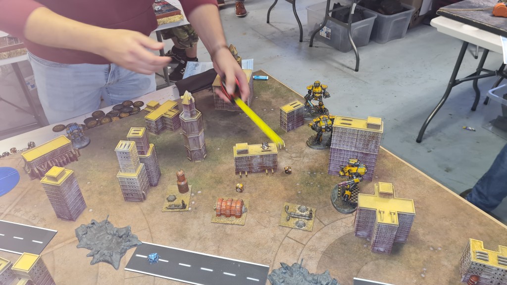 I pushed out on either side and Full Strided the convoy up the board. My opponent played Titan hunter Infantry – which is a lamentable strategem I would gladly see excised from the game, it was almost ubiquitous at this event. There was precious little shooting as the game began with breaking dawn rules – 12′ range – which I wish I had been awake enough to note as I had set the First Fire order on one of my Reavers.