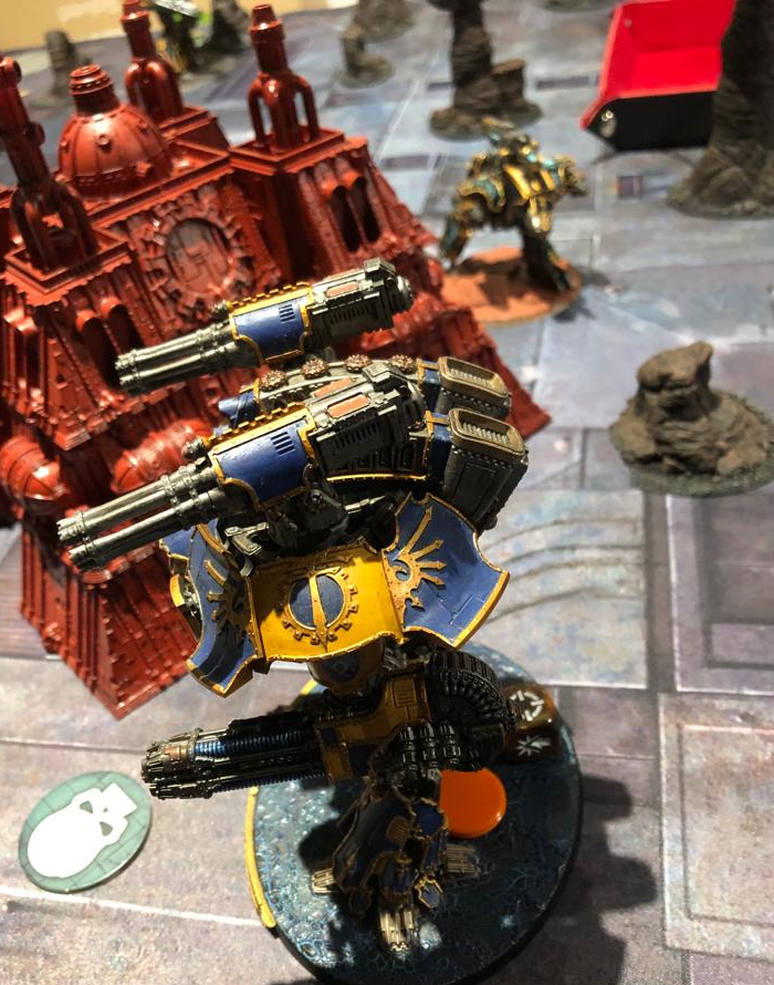 The twinned Warlord did not forget and after the Extergimus-infused Quake and Graviton shots were done, the Warhound was no more. Alex followed up with his dual-Graviton Warhound and missed with both. The first turn had gone in Vulcanum’s favour, but with a Knight and Warhound still closer than I would like to my lines and Dauntless facing off against my Princeps on the other side of the table, I was far from confident that the day was won.