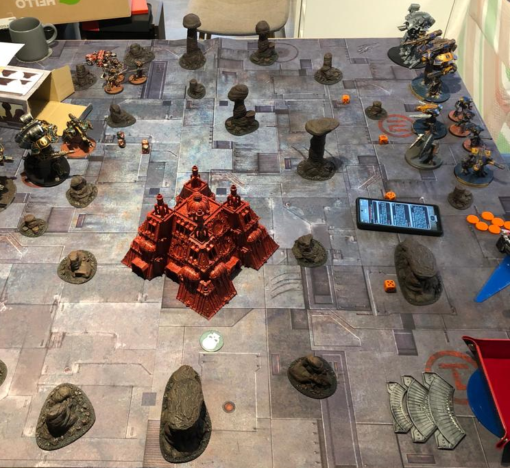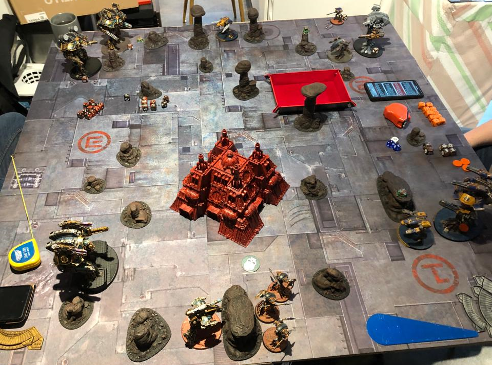 Deployment was 12′ by 12 boxes on the corners – obviously ignored by my Direwolf, who snuck herself into hiding behind the massive Mechanicus Forge Fane (this model was the spur to me purchasing Joel the 3Dprinter and is a massive accomplishment from GrimDark terrain) ready to dash into the heavy cover of some rocks running up against the table edge.