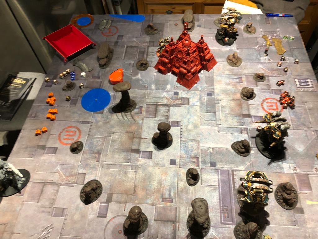 So, as I have my final tournament event of the year next weekend (Warfare 2022) Alex kindly found time to pop over and play a second game – this time with LSW (LongSufferingWife) in attendance so that she could refamiliarise herself with the game, be amused by our over-the-table banter, take photos at the top and bottom of turns and, perhaps most importantly of all, provide sounds effects for void shields dropping and being raised. We provide atmosphere round these parts.