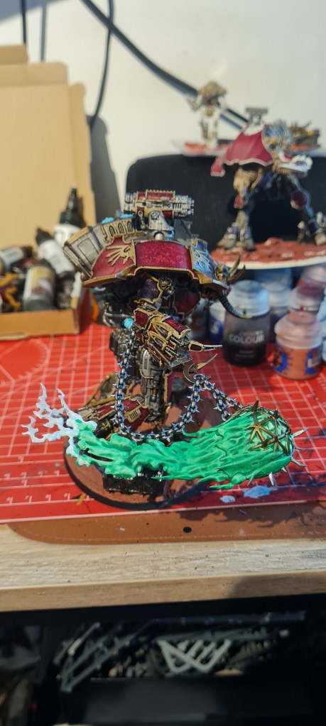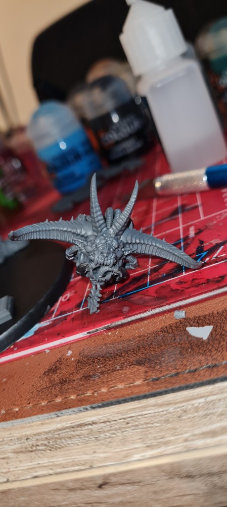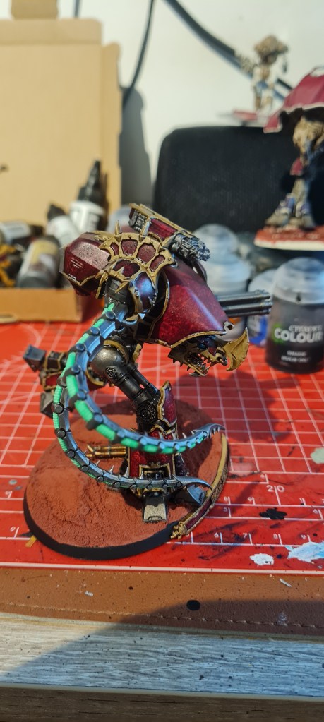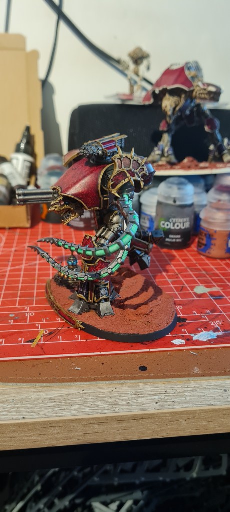 I also knocked up some Daemonic Gatlings for the carapace from some cut and modified Maulerfiend parts but… they feel too big and the scale disparity is making them less attractive to me now… I may have to replace those. EDIT: I replaced them with FW Vulcan Megabolter Arrays. Pretty useless in gaming terms but they look cool.