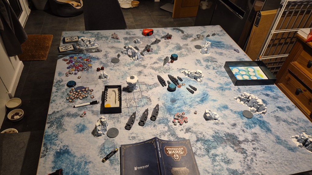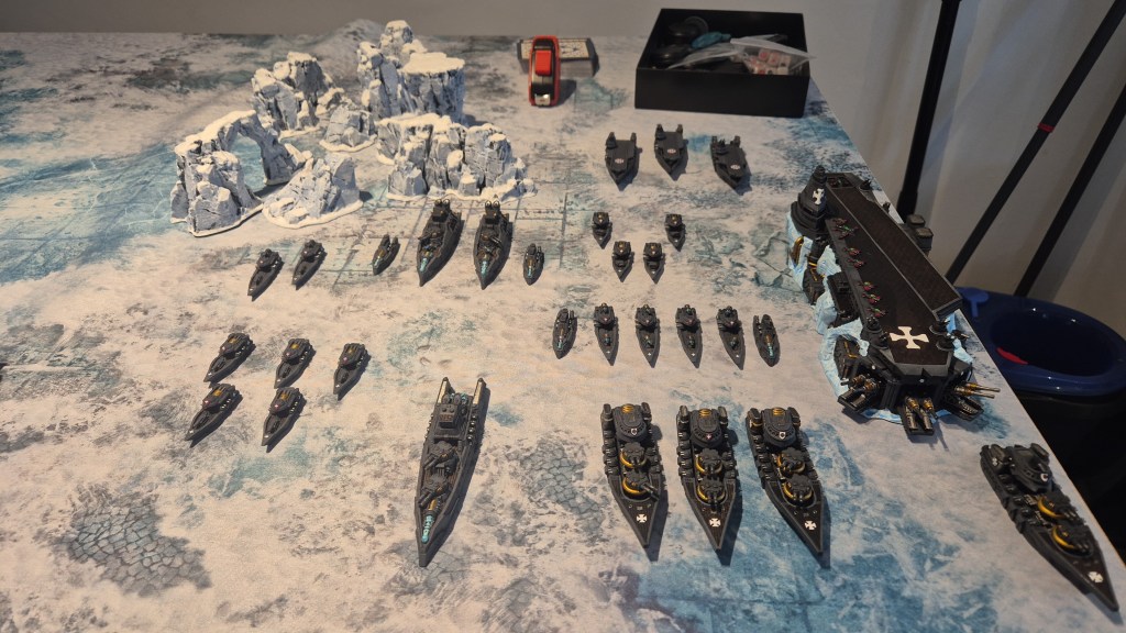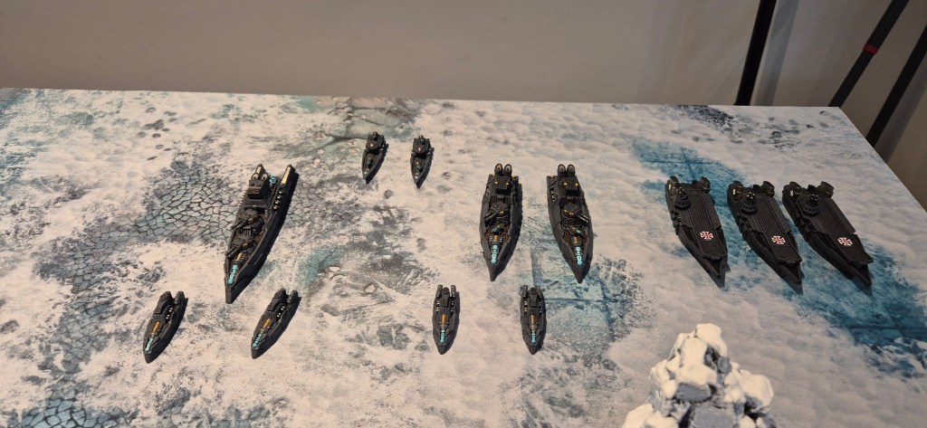 The Ice Maiden Battlefleet box has the gargantuan Super Carrier, 6 Cruisers, 6 Destroyers and 6 Frigate. That is a huge amount of ship for your buck and immediately opened up options. Adding an Elector Battlefleet and Ragnarok Battlefleet further opened up a host of options and gave me clear direction towards my next intended purchases. Later, I’ll need some Air and I want some more Carrier options and at least one Shield Generator Ship, so Zeppelins, Templehof and Konig are on the list for my next installment… possibly a Falkenstein set too. I’m not the type to enter a system softly or subtly – this would leave only the Scions of Jutland on my intended purchases, and those will have to wait until gainful employment once more finds me.