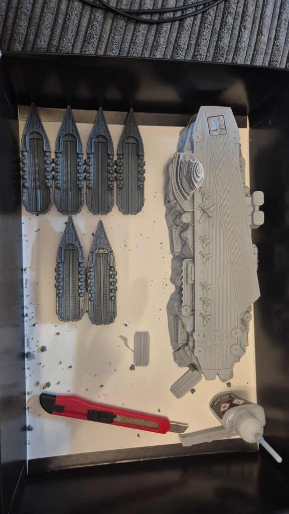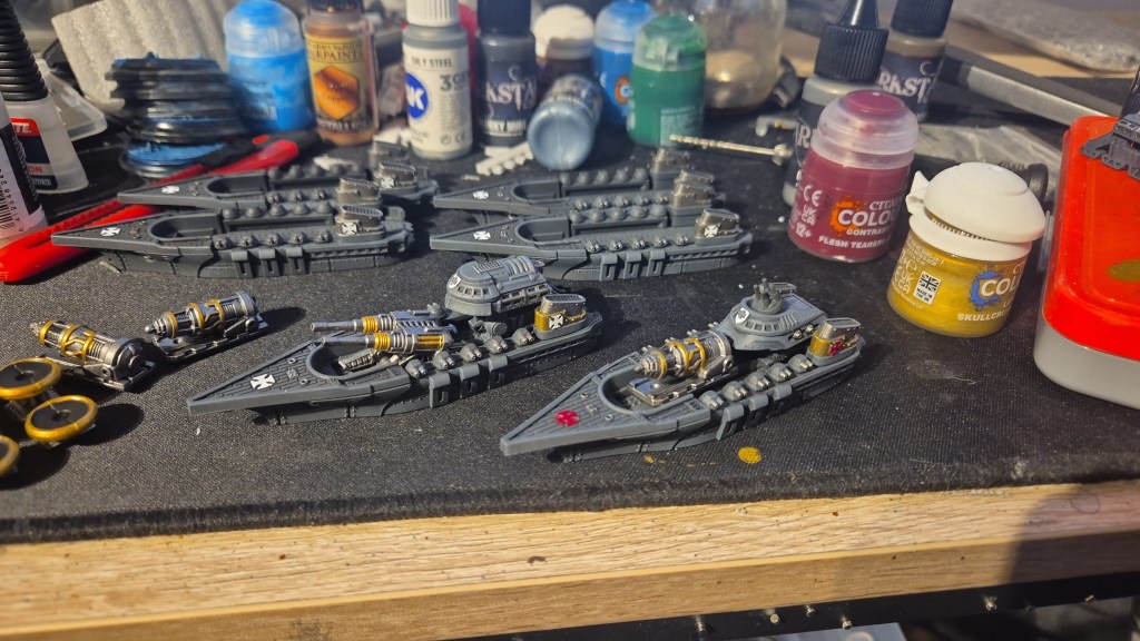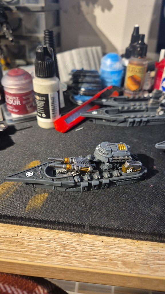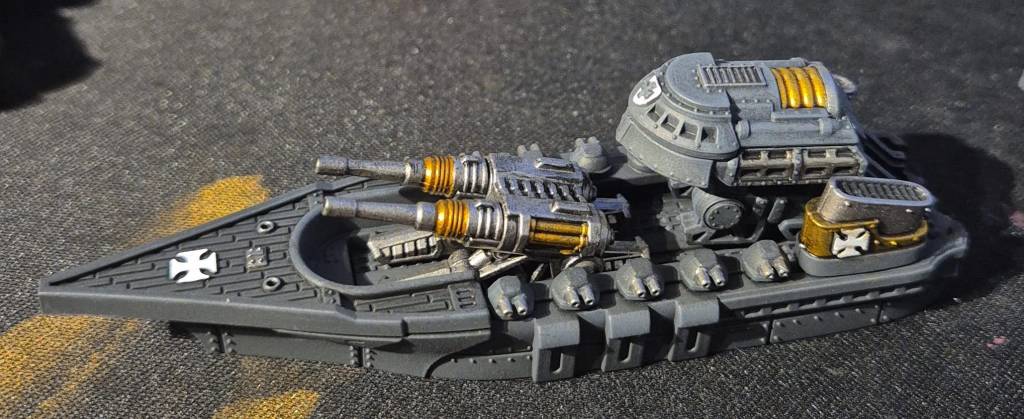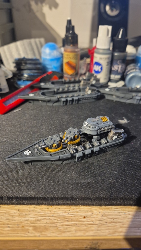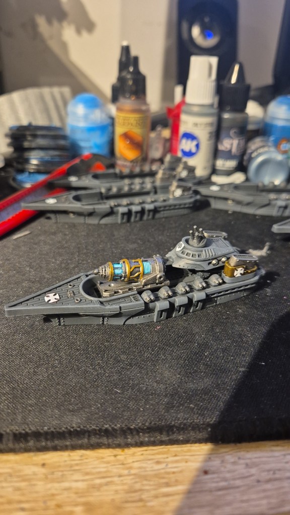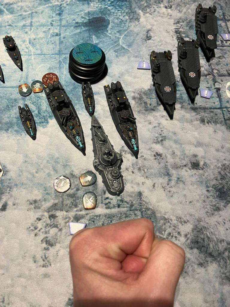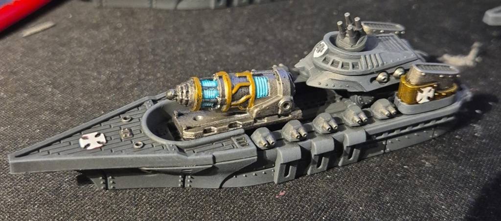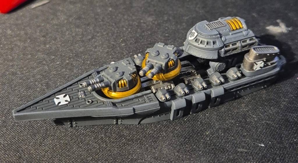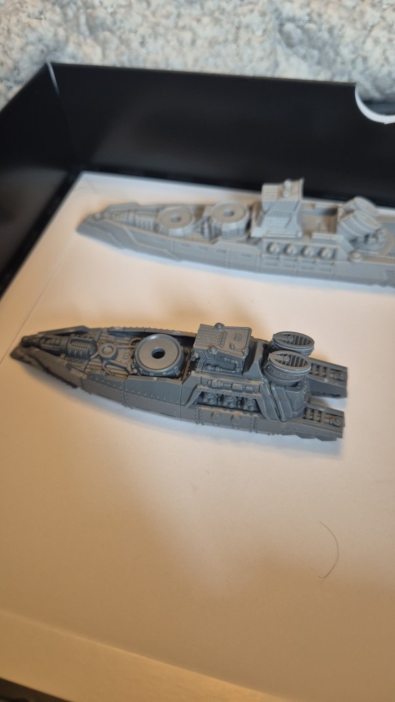 So, as I find myself with a small but growing collection of ships, a few different ways in which to play them and more in the production line, the next task is to find people to play! Fortunately, my regular Titanicus playing partner, Alex, was happy to help me out by playing a game with some of my ships as proxies for some Crown forces – which was absolutely and totally not a part of him getting hooked on learning the rules and considering whether or not to buy-in. We took just over 500pts each and worked through some of the basis rules. As we finished the game, I was hooked. The exploding dice, the combined shot-pools, critical effects and momentum and limited turns! It had everything I want in a naval game and several things I didn’t even realise I wanted!