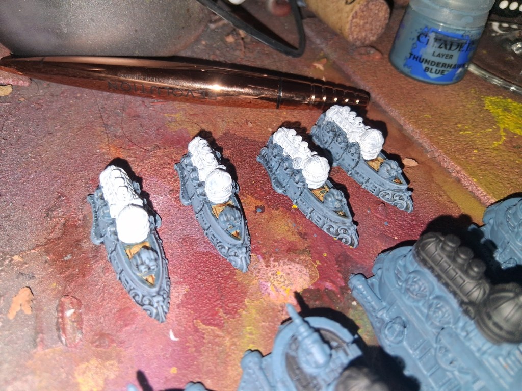 After stressing and overthinking my last few Titan projects and finding myself, shall we say, dissatisfied with how they had come out, I think I need a project I can take easy and not stress over. Go back to basics, as it were. To begin, I painted some of my ebay ships – a lot of the heavy lifting was done by drybrushing and washes, and honestly, I’m quite pleased with them. They are quick, low stress and have a nice finish. Did I underestimate myself? I wanted a simple blue grey on the bulk of my ships, with a bright yellow decking. At time of writing I’m seriously considering keeping away from metallics on these ships, with the exception of French fanciness and filigree.