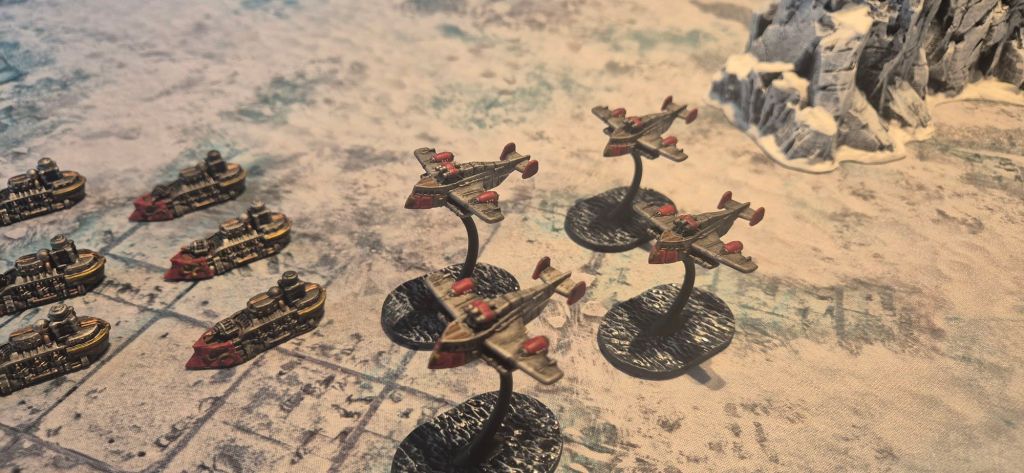 But, torpedo-spam seems to work – three Caliburns with torpedo turrets were a constant nuisance to Jay’s carrier group. I might need to work on magnetising and painting some more torpedo turrets.